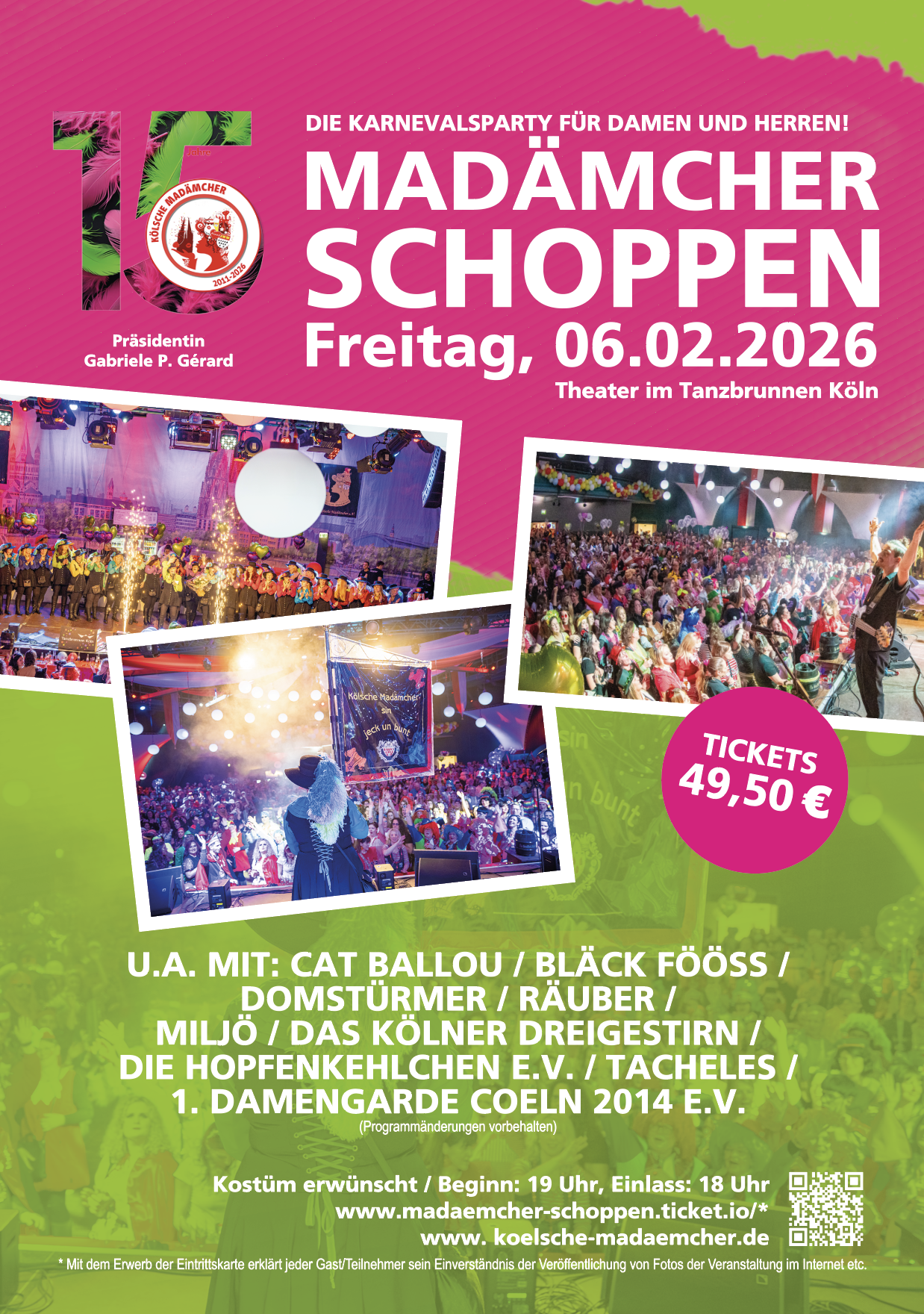 Der Madämcher Schoppen im Theater am Tanzbrunnen ist DIE traditionelle Karnevalsparty in Köln.Ausverkauft im letzten Jahr starten wir nun in den Vorverkauf für unsere Jubiläums-Session in 2026. Wir freuen uns auf euch und ein mega Programm. Sichert euch jetzt eure Tickets hier auf ticket i/O oder bestellt unter: karten@koelsche-madaemcher.de